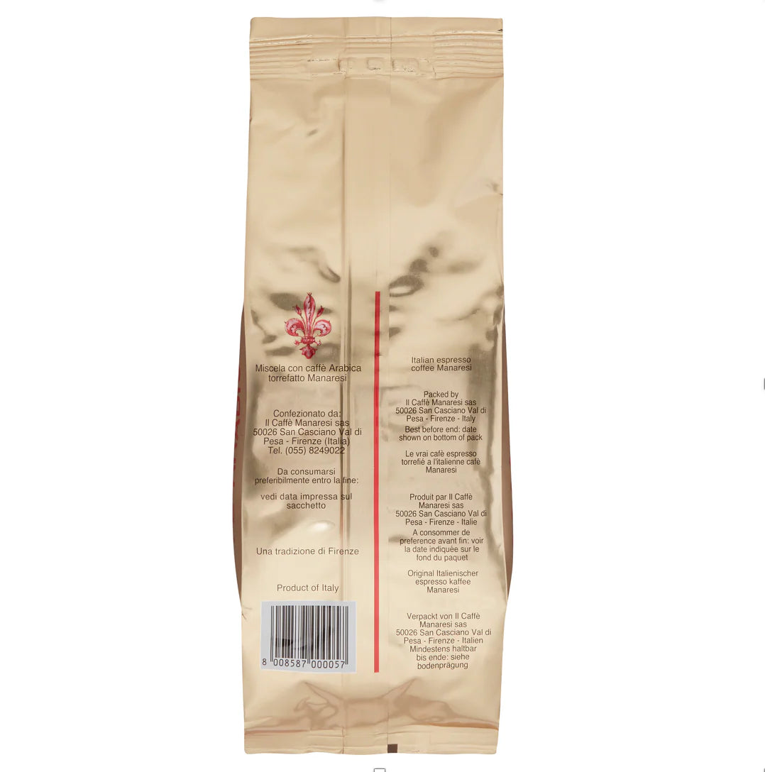 El café Manaresi Gran Bar Oro es una mezcla italiana de alta calidad, producida en Florencia desde 1898, caracterizada por un 90% de café Arábica y un 10% de Robusta.
